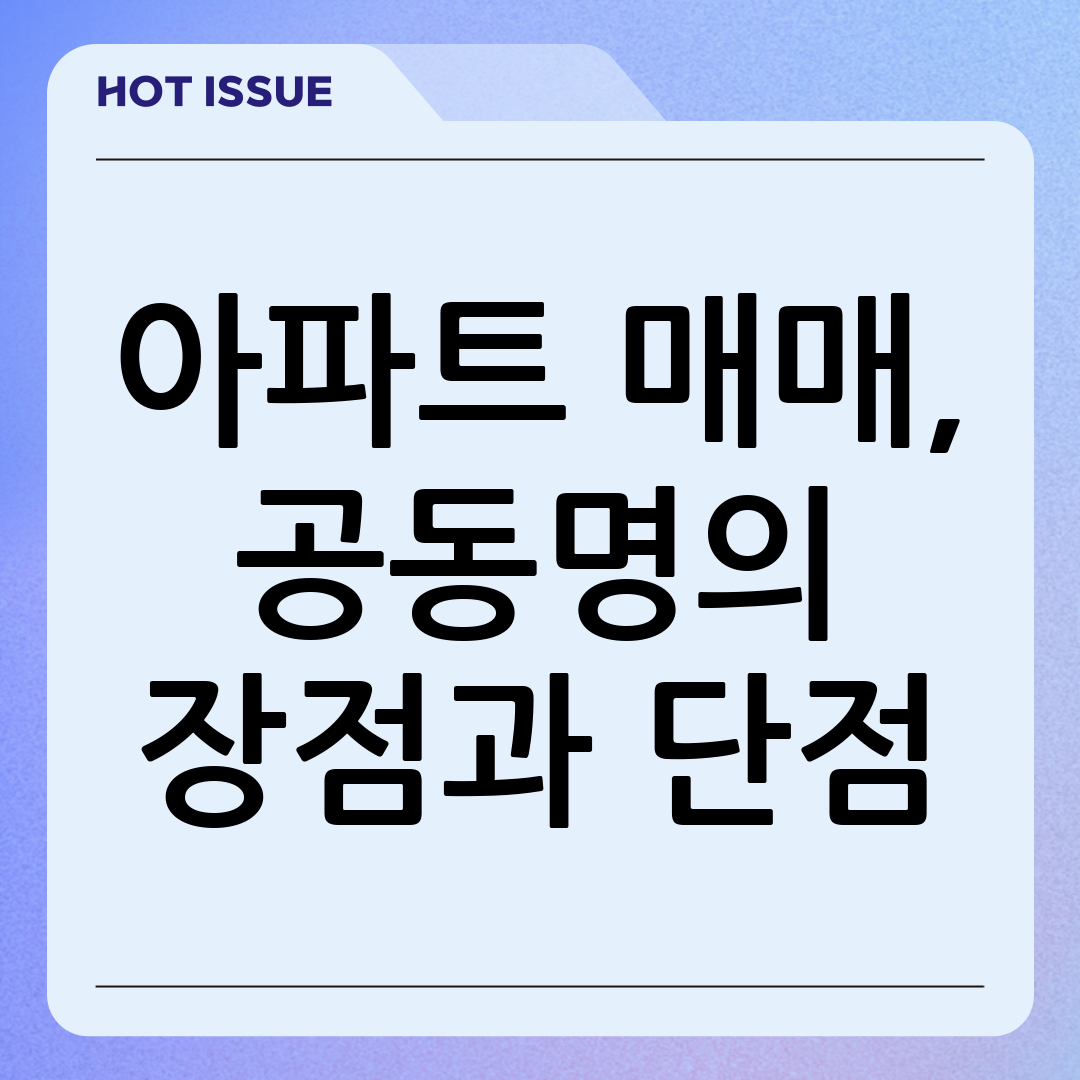 부동산 시장에서 현명한 결정을 내리는 것은 매우 중요합니다. 특히 아파트 매매와 같은 큰 거래에서는 더욱 그렇습니다. 공동명의는 여러 장점을 제공하지만, 동시에 고려해야 할 단점들도 존재합니다. 이 글을 통해 공동명의에 대한 이해를 높이고, 자신에게 맞는 최적의 선택을 하시기를 바랍니다.